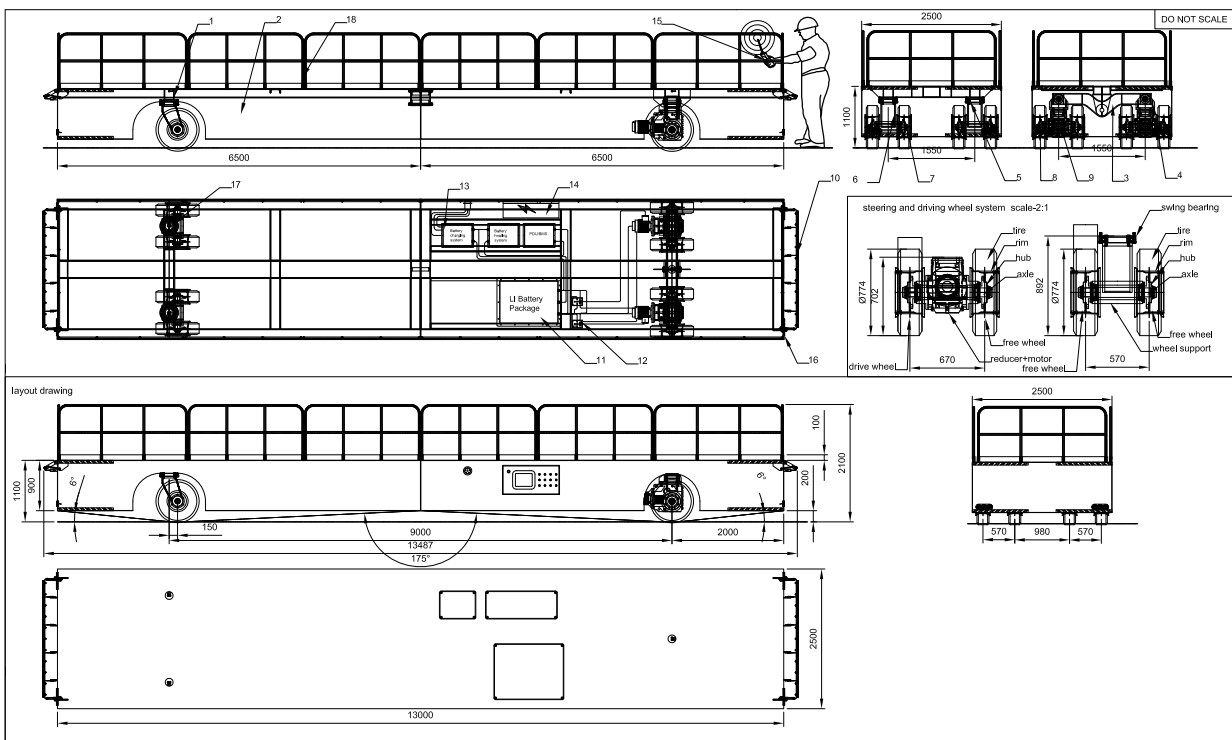 Телега производственная самоходная 24 тонны AGV Описание на колесную тележку: Грузоподъемность: 24 тонны 1 поворотная ость (максимальный угол поворота) Рабочий диапазон температур: -20/+40 С Постоянная работа на улице под открытым небом, перевозки склад-склад до 500м Дорожное покрытие: асфальт, бе… Читать дальшетон (зимой может быть припорошен снегом) Возможность работы в условиях атмосферных осадков (дождь/снег) Габариты платформы: 13 000 мм х 2 500 мм Скорость платформы до 30 м/мин (плавный пуск и торможение) Управление с джойстикового р/пульта+резервный п/у на кабеле (предусмотреть возможность подачи гудка с обоих пультов в случае опасности на пути следования тележки) Литиевый АКБ на 6 ч непрерывной работы+ зарядное устройство Датчики против столкновений, светозвуковая сигнализация Проушины для стропил Ограждения (борта) по периметру исключающие падение груза Защитный бампер (опционально) Дополнительно: - запасной АКБ - ЗИП на быстроизнашиваемые детали
